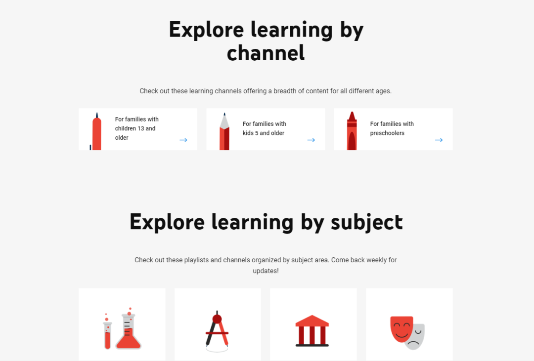 ???? Youtube也开设了Learn@Home频道,针对有各个年龄段的孩子的家庭,有不同的在线学习项目可以选,也可以根据感兴趣的科目自由选择~